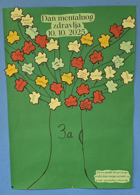 Učenici 3.a razreda uz pomoć psihologinje razgovarali su o pojmu mentalnog zdravlja te kako ga možemo poboljšati. Učenici su pripremili stablo na čijim su listovima ispisali male načine na koje svakodnevno možemo poboljšati naše mentalno zdravlje i uspješno se nositi sa svakodnevnim izazovima. Neki od njihovih prijedloga su: prošetati, igrati se s kućnim ljubcima, slušati glazbu, provesti vrijeme s obitelji ili prijateljima, duboko disati, plesati, crtati, slikati, nekoga zagrliti, spavati… Svoje stablo izložili su u školskom holu kako bi i drugima omogućili podsjetnik koje male stvari u danu mogu učiniti da se osjećaju bolje.